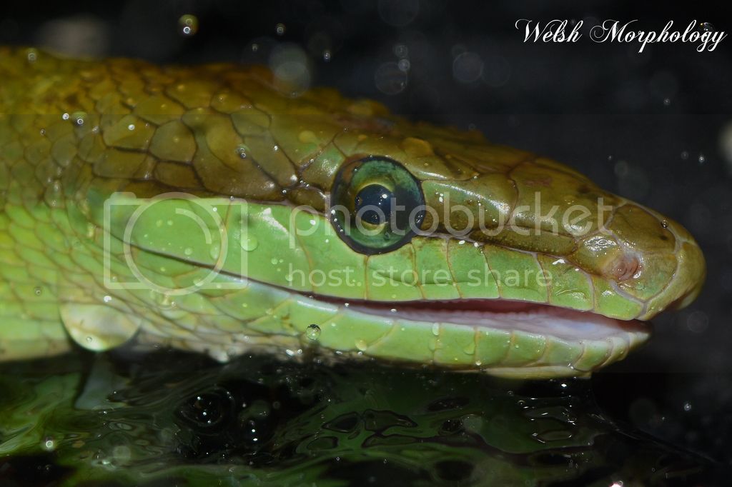 The "Green Goddess" red tailed racer is in blue at the start of shedding again. She doesn't drink from standing water so she drinks from droplets spayed